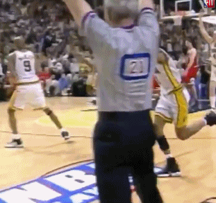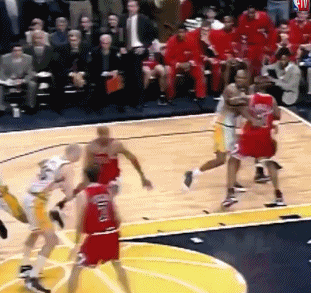 在比赛最后时刻,米勒面对乔丹的跟防,一把推开帮主,接球完成三分绝杀,带领球队以96-94击败公牛。进球后的米勒,兴奋地在场上直跳!